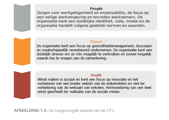 De laatste P staat voor Profit, maar hierbij draait het niet om maximale winst. In een sociale onderneming betekent profit dat een organisatie financieel gezond moet zijn, zodat zij kan blijven bestaan en haar maatschappelijke doelen kan blijven ondersteunen. Winst maken is dus belangrijk, zolang deze winst op een verantwoorde manier wordt ingezet. Het boek benadrukt dat organisaties alleen als sociale onderneming gezien kunnen worden wanneer winst sociaal wordt aangewend en openlijk wordt gecommuniceerd. Een goed voorbeeld hiervan is ASN Bank, die stelt: “ASN Bank investeert in duurzame ontwikkeling.” De bank gebruikt financiële middelen om duurzame projecten te ondersteunen en stimuleert verantwoord gedrag binnen de financiële sector. Daarmee laat ASN zien dat winst en maatschappelijke betrokkenheid hand in hand kunnen gaan.